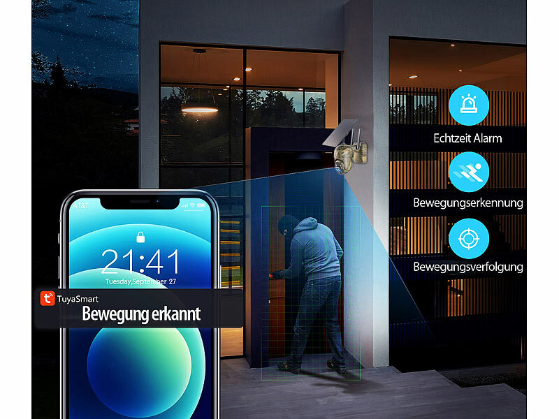 Behalten Sie Ihr Grundstück bestens im Blick: Ihrer neuen Überwachungskamera im unauffälligen Tarn-Look entgeht per Bewegungssensor nichts und niemand. Und sogar im Dunkeln hat sie dank automatischer Nachtsicht in bis zu 20 Metern ein wachsames Auge!Autarker Betrieb: Das separate Solarpanel lädt den Akku bei Sonnenschein permanent auf. So kommen Sie bei ausreichend Licht ohne externes Laden aus! Das Solarpanel montieren Sie ganz nach Bedarf entweder auf dem Kameragehäuse oder dank Verlängerungskabel an einem anderen sonnigen Ort.